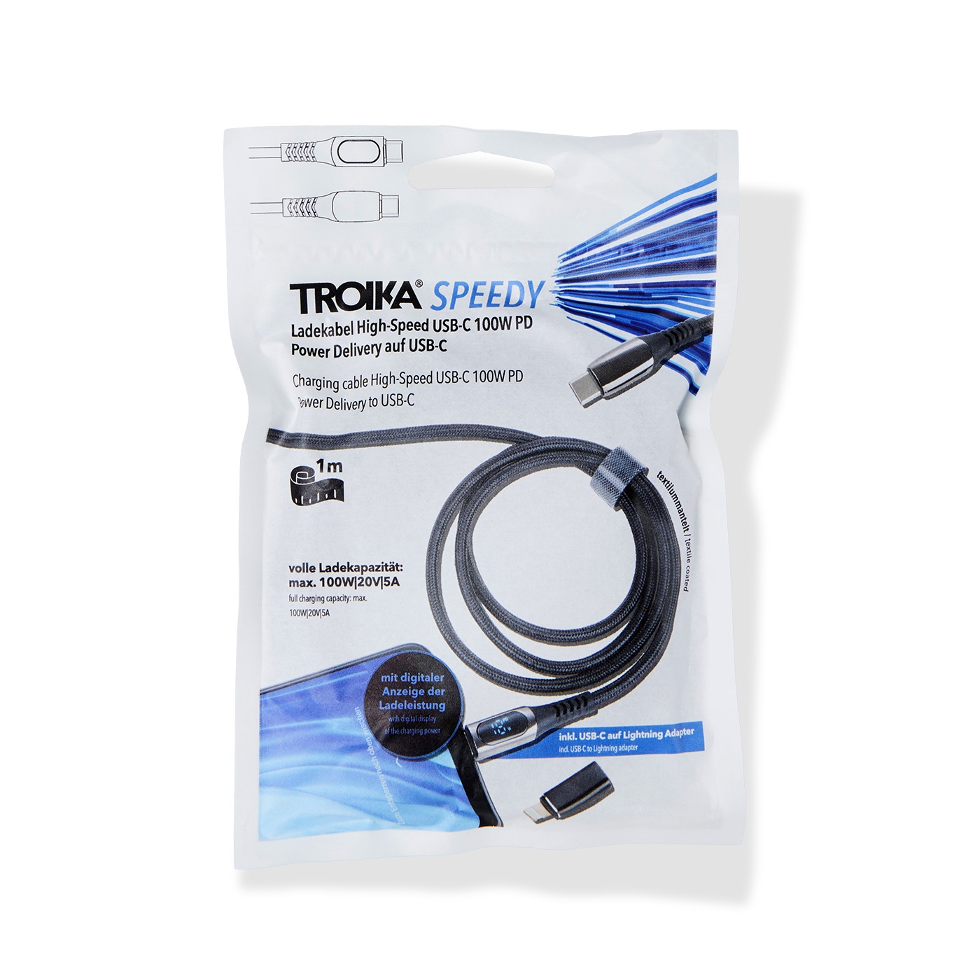 Speedy charging cable by Troika. 100W from USB-C to USB-C with an adaptable lightning connector attachment.
